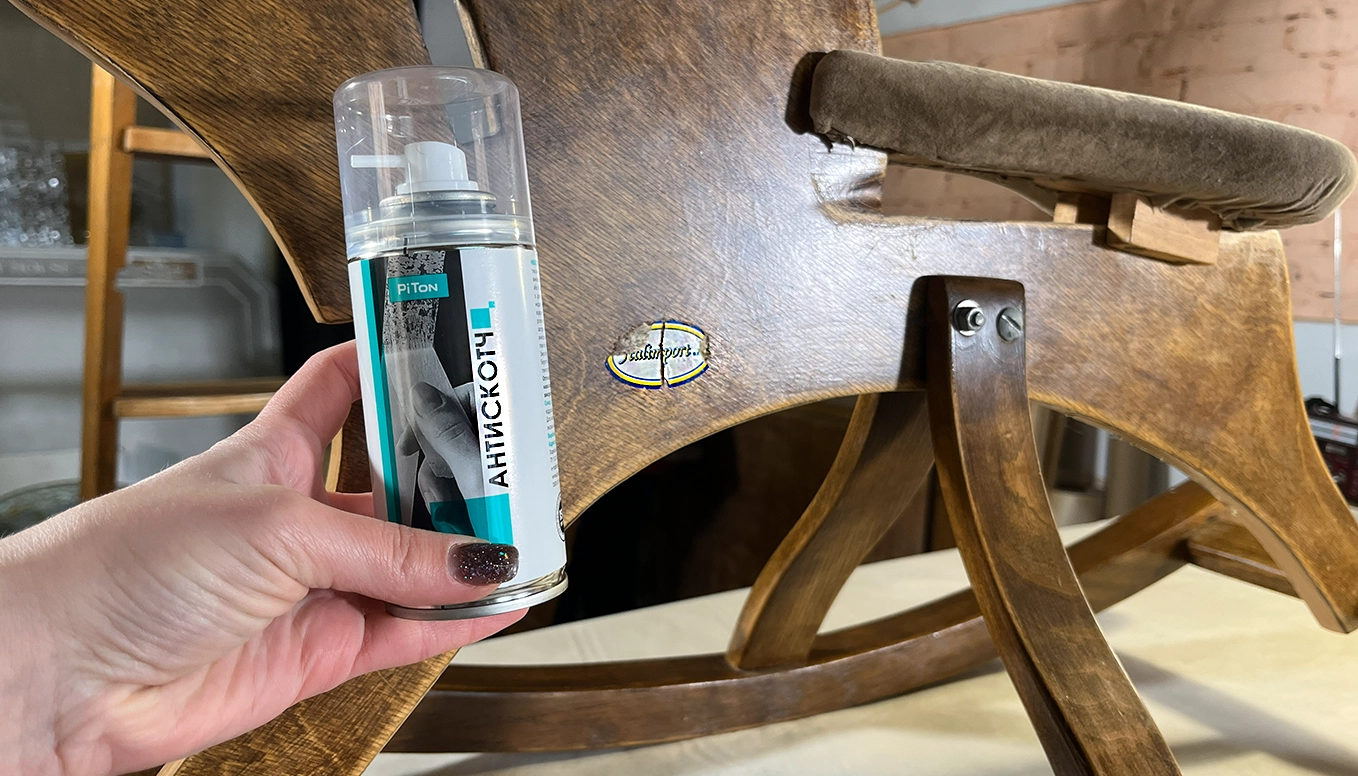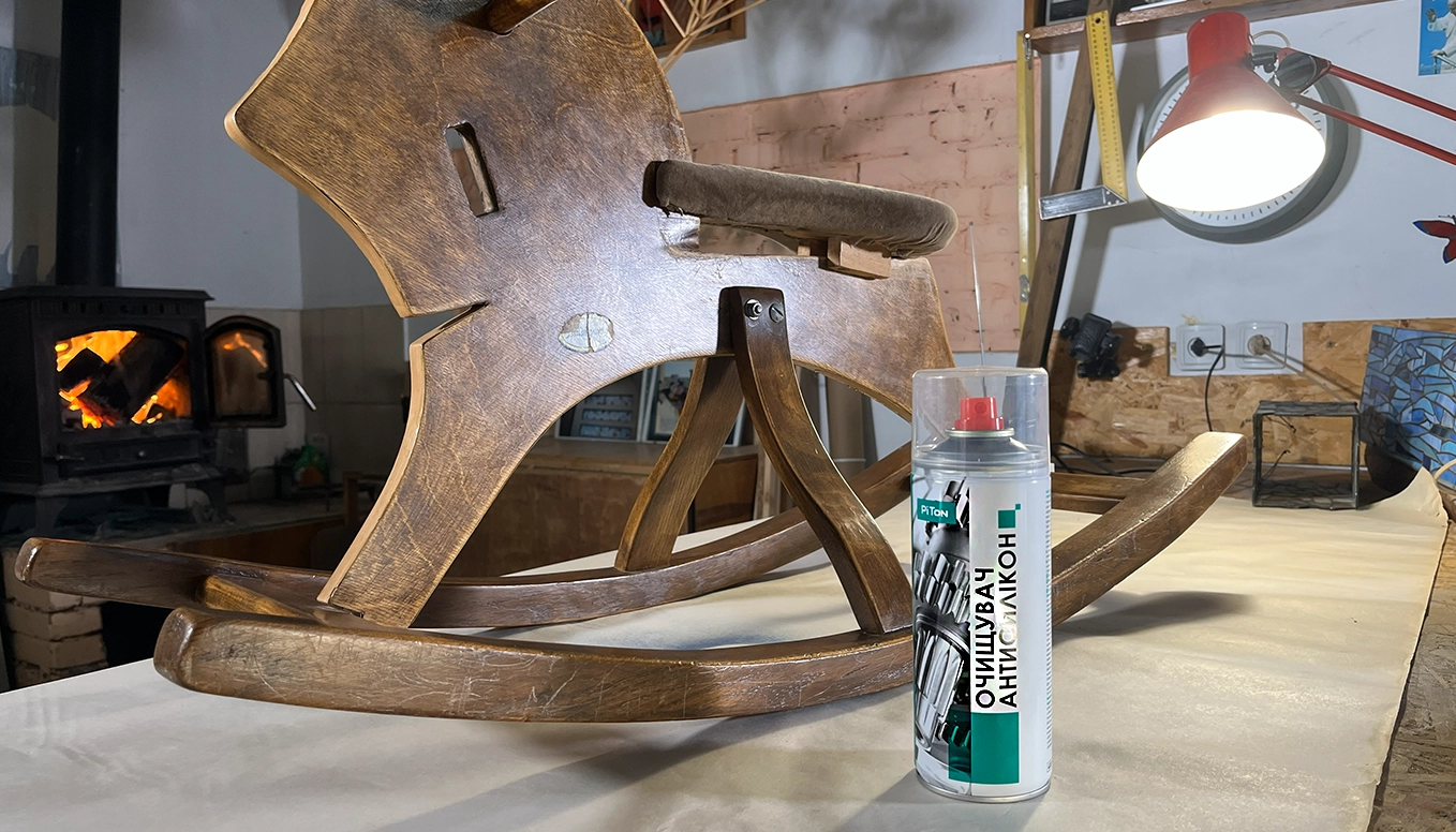 Якщо на поверхні є наклейки або клейові сліди, спочатку треба їх видалити. Антискотч PiTon м’яко розчиняє клей, не пошкоджуючи деревину. Наносимо засіб, чекаємо кілька хвилин, акуратно знімаємо наклейку. Клейові залишки стираємо серветкою.