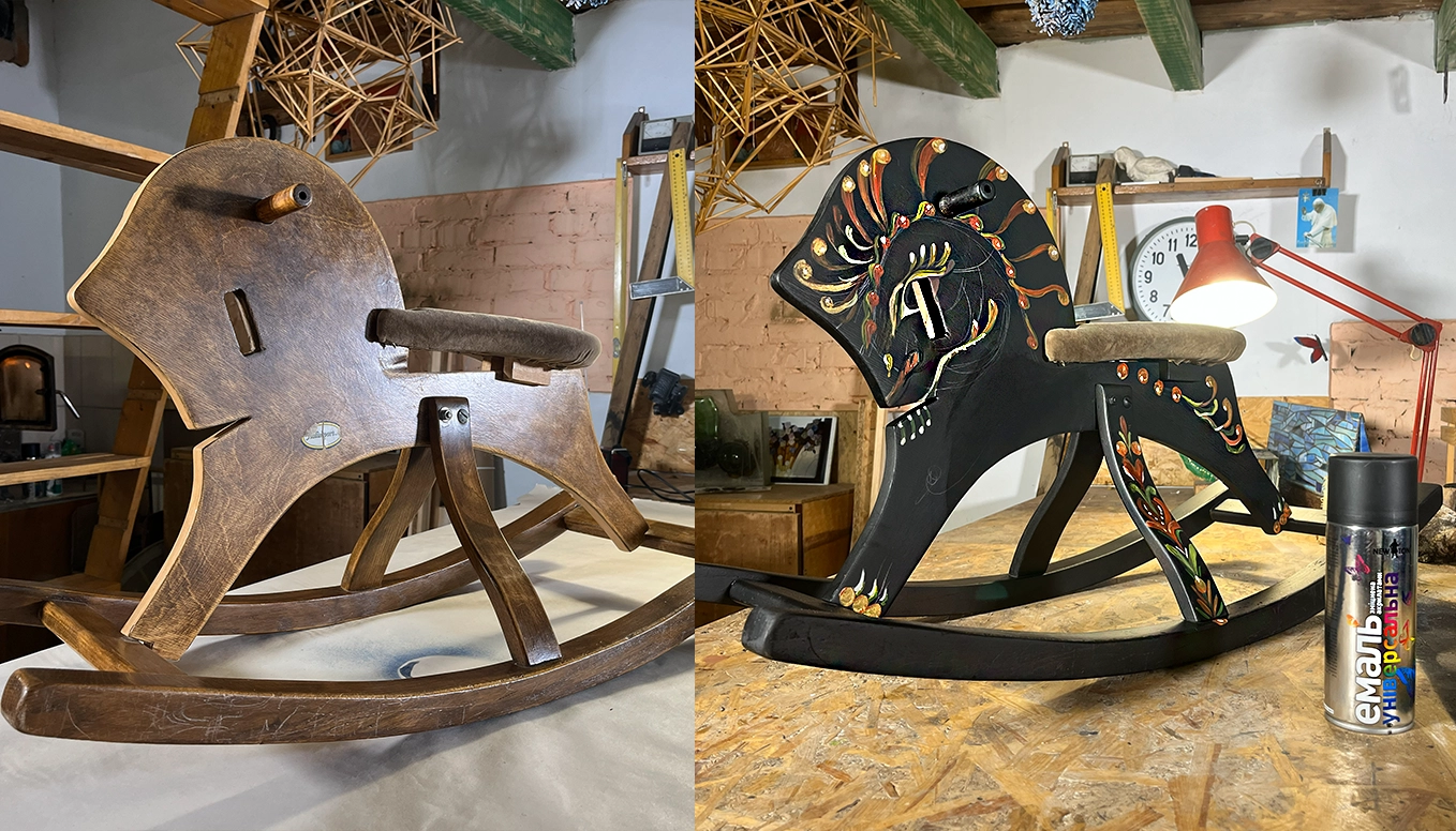 Коник-гойдалка з натуральної деревини був світлим, простим, нейтральним. Після фарбування чорною матовою фарбою NewTon — зовсім інша історія. Поверхня змінила сприйняття форми, підкреслила лінії, додала глибини, створила присутність.