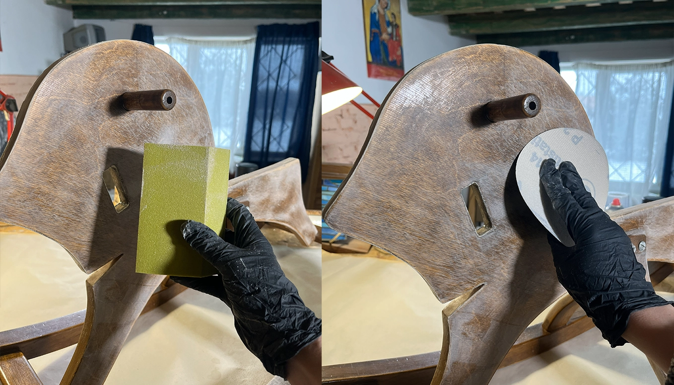 Потім дрібнішим папером (P180-P240) шліфуємо до гладкості. Рухи — вздовж волокон деревини, щоб не залишати царапин. Після шліфування обов’язково змести пил м’якою щіткою або тканиною.