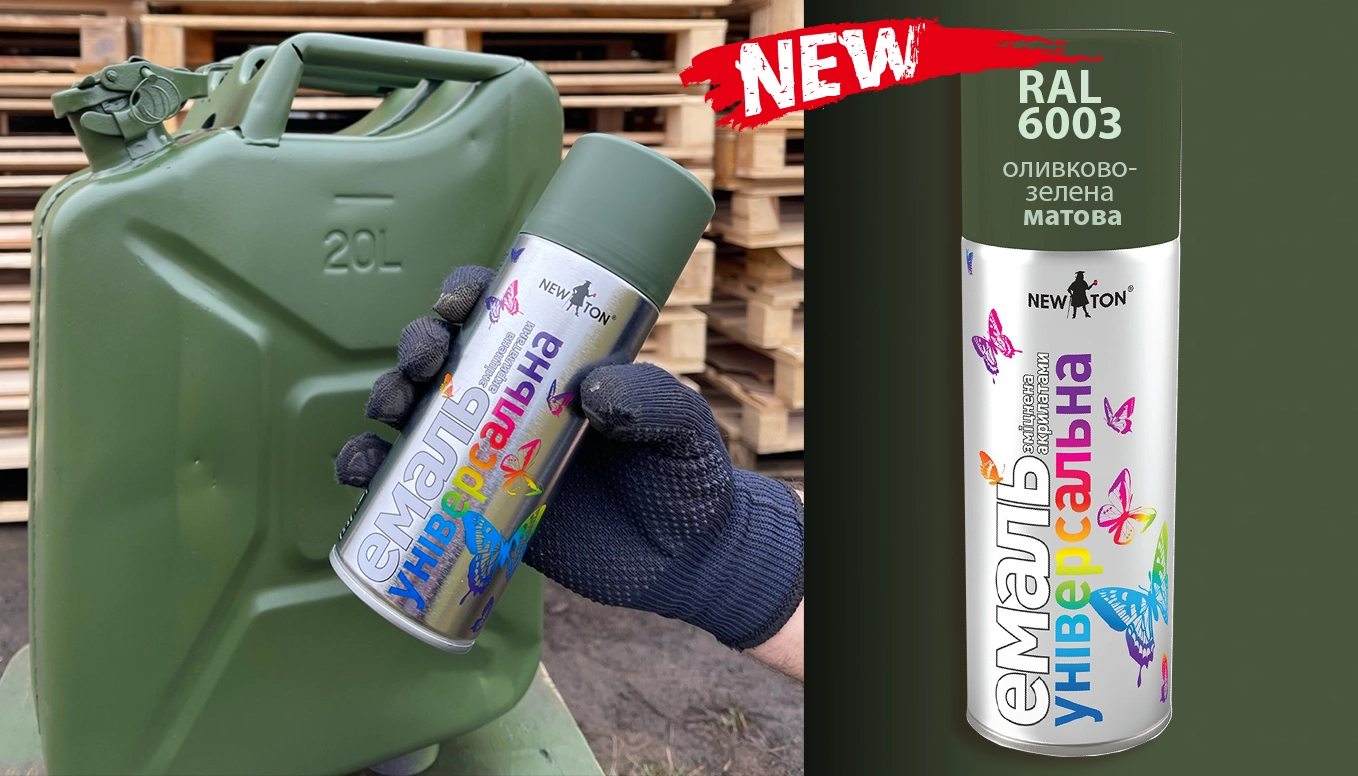 Універсальна аерозольна емаль NewTon представлена в широкій палітрі RAL-відтінків, серед яких тепер і RAL 6003 оливково-зелена матова.