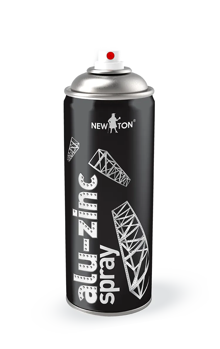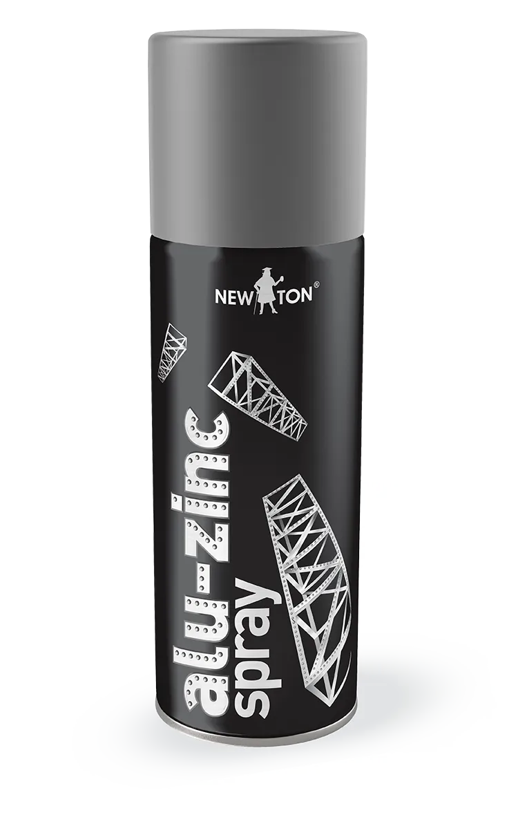 Alu-zinc spray NewTon — емаль з високим вмістом цинку та алюмінію для антикорозійної обробки оцинкованих поверхонь, виробів зі сталі, алюмінію, чорних і кольорових металів. Утворює міцне глянсове покриття, стійке до атмосферних та механічних впливів, мастил, сольових розчинів, перепадів температури. Використовується для ремонту дахів, монтажу оцинкованого профілю, водостоків, відливів, огорож, систем вентиляції, кондиціонування та трубопроводів, реставрації кузова автомобіля та вихлопної системи. Не фарбувати поверхні, які можуть знаходитись під впливом відкритого вогню.
