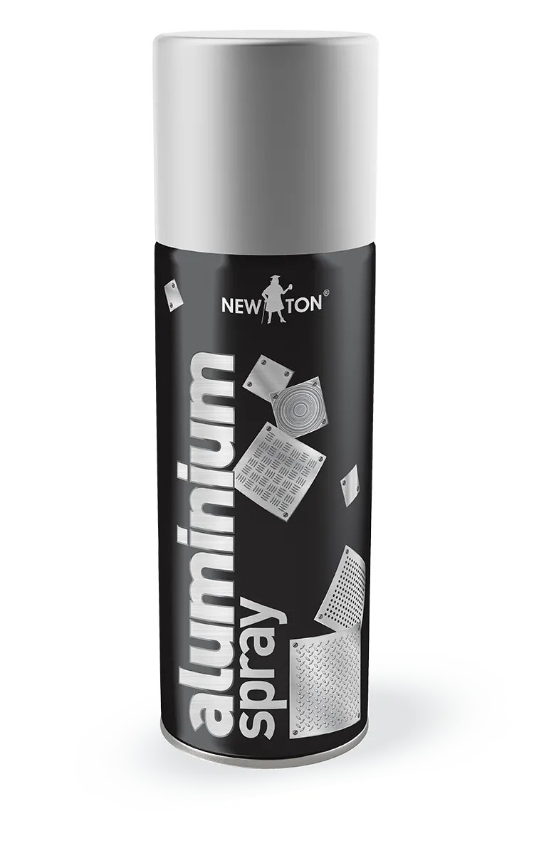 Емаль Aluminium spray NewTon — алюмінієва емаль для захисту, реставрації, декоративного фарбування поверхонь з металу, дерева, скла, цегли, бетону, пластику тощо. Містить дрібнодисперсний алюміній високого очищення (99,5%). Утворює міцне глянсове покриття з алюмінієвим блиском, стійке до бензину, мастил, сольових розчинів.